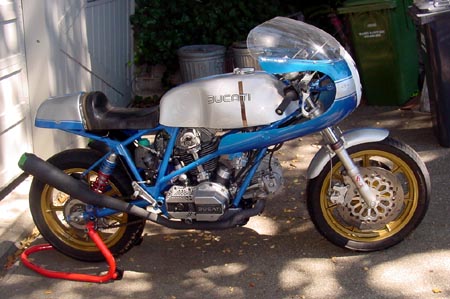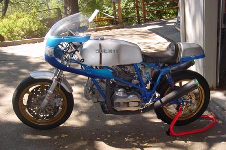 Steve, Here are the photos we took last week. The racer weights in at 374# wet with half tank. Bike was owned and raced by Art Chambers. He one at least one AFM championship on this bike. It also has done well at AMA Nationals. Engine and frame mods performed by Para Performance, and Ken Augustine. Transmission is a close ratio from Chris Wermuth of North Shore Gears formerly with webster gears. Most recently the bike has been raced in AFM Super Dinosaur with Jim Neuenberg in the saddle, a class for street based bikes till 1985. Jim managed to finish second in all but one outing, when he finished third. We can't compete with the horsepower of one highly modified FZ 750 yamaha. A refreshed and improved engine is in the works and hopefully will be in place for the start of the 02 season. We may also switch to 17inch wheels with a wider profile so we can run more modern rubber. We currently run Avon am22/23 in 110 and 150 width. Cheers, |
