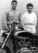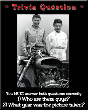 And the winner is...... Our very own Uncle Tod Rafferty aka Team Geezer (almost by default I might add,..... he sent in like 30 guesses and was running out of options!) We had 3 other guys who got 2 out of 3 correct,..... John Burkhard, Ron Kloetzli and Bob Moberley. We had just over a hundred entries in total, can;t believe i stumped everyone as i had JUST put together a page about Frank S the day before with pictures of his face as well,..... Farne has been in a bunch of books,....... So, the guys are on the left, Frank Scurria and on the right, Franco Farne. The picture was taken at ZDS in Glendale, California. It was at a dealer school. Franco Farne was the instructor and he used Frank's Ducati to show the dealers how to tune it for racing. The bike in the photo is a 200 Americano and the picture was taken in 1959 by Ron Kloetzli. Scurria had a hand in Gordon Jennings Ducati 250 Cycle World project racer in the mid-60s. Quoting from "Ducati" by Tod Rafferty (signed copies still available for $20 incl. shipping), "Frankie was pretty fast on a motorcycle, and he was a completely engaging character and always up to something absolutely mad. He broke his leg badly, the second time, at Daytona in 1965 where I found him rolling around in front of my front wheel. "He smashed the leg badly enough that they were going to amputate it, and he said nothing doing, just splint it and send me back to California. When he got back the real doctors, orthopedic surgeons, patched him up." Scurria took up car racing and became a cop in Los Angeles. He's probably about 60 now, think Steve Allen has more info his site. Franco Farn� began with Ducati in 1951 (before Dr. T.), and became the lead development rider; he was also an ace racer and mechanic. Farn� worked for both Taglioni and Bordi, and only left Ducati last year. Interesting to note that when they sent someone to the States in 1963 to instruct the Yanks on small Italian motorcycles, the sent a small Italian. Tod <[email protected]> I owned Frank's 250 champ bike and regrettably sold it. Fortunately, it is still in the area and I am trying to get it back. It had a copy of the the first Ducati 250 engine that either Frank or myself can imagine, courtesy of a local bore and stroke by Frank himself. As you know, most people don't appreciate that he also created the first 350 Ducati as well. A terrific guy and greatly under appreciated among Ducatisti, but then as we all saw up at Las Vegas, most Duc people including the director of their museum really don't really understand that it all began before the twins. Lastly, let me say that I appreciate your effort. It is essentially thankless. Such are most of the things that we feel passionate about and wish to share with others. Best Regards, Ron Kloetzli <[email protected]> There ya go. Frank is a super cool guy, I have not met Franco but you can read about him in just about every book ever written about DUCATI - ace mechanic, test rider, racer, one of the official Ducati mechanics to follow Mike "The Bike" Hailwood during his stunning '78 TT victory...... What is so super about this picture is when it was taken. look how young these guys are! Franco just retired from DUCATI last year or so was it? it is so interesting to me as a racer to meet other racers that have been there and done that.... Long ago... on the old tracks, before really good pavement or any kind of pavement in the pits... on the old bikes and hard tyres! I wonder how I will be when I have been around that long? I doubt anyone will remember my racing exploits but still, I like to give these guys the credit they deserve.... I know what a tough time it is making the grid. Every weekend. Count on more info about Frank Scurria's racing tenure to show up on my site in the future. He most certainly is part of the DUCATI history book and I will be doing my part to help document it further..... Cheers Steve Allen <Steve @ Bevel Heaven Dot Com > |